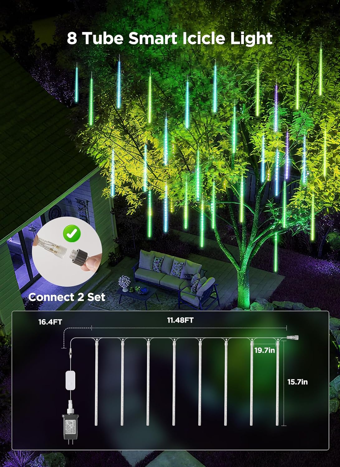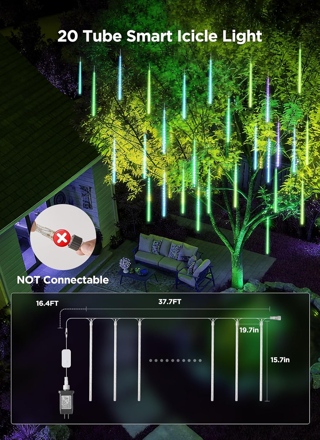 Specification - Available in 3 sizes to fit different spaces: 11.48 ft (8 pieces of 15.7 in tubes), 24.6 ft (16 pieces of 15.7 in tubes), and 37.7 ft (24 pieces of 15.7 in tubes), all featuring 19.69 in spacing between each tube plus an extra 16.4 ft lead wire for convenient power connection. Note: These meteor shower lights are not connectable.