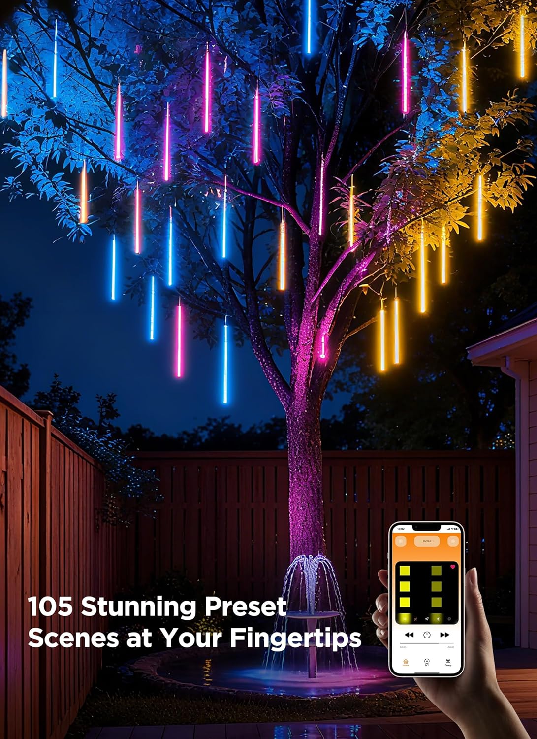 Smart APP Controlled - Easily control your outside Christmas lights remotely via the "SmartDawn" app. Choose from 105 dynamic scenes and holiday themes, or use a palette of 16 million color options to DIY your personalized lighting effects, including the classic warm white and cool white meteor shower lights outdoor. Additionally, brightness and speed are fully adjustable.